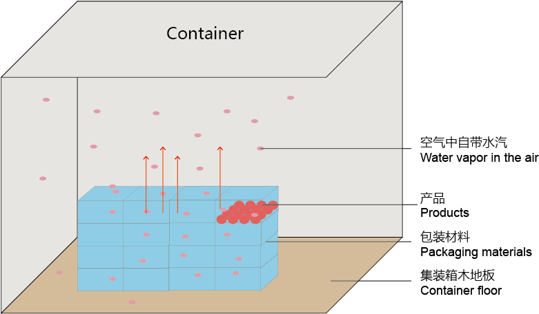 在开放的空间中,和水汽来源有关的有降水量、水体面积、蒸发条件、土壤水分含量、植被覆盖度等因素,以及影响水汽输送的条件如风、垂直气流等,都会影响湿度。在集装箱运输中,集装箱中的水汽供应量包括空气中自带的水汽、产品及包装材料所含的水分、集装箱木地板中的水分,以及集装箱与外界交换的水汽等。