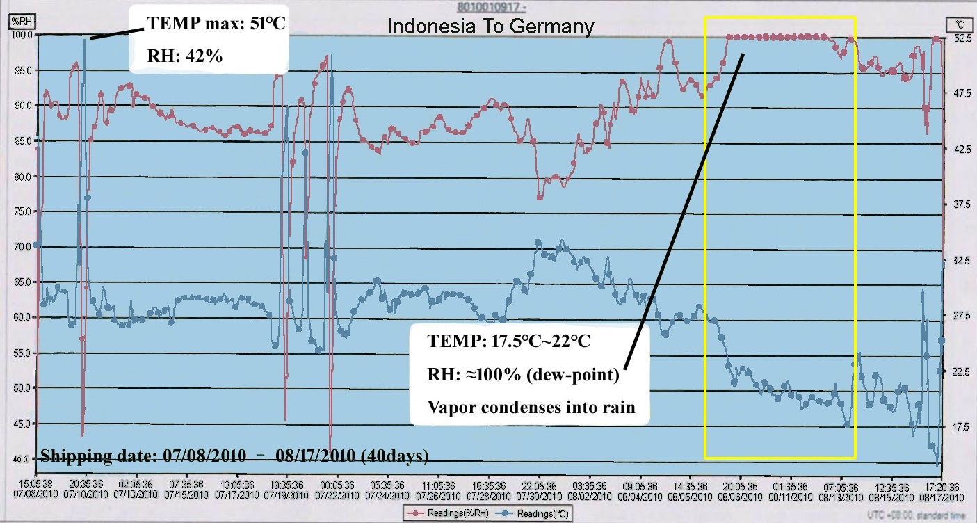 集装箱内空气在高温时吸纳了大量的水汽,当集装箱从高温地区进入低温地区,或者昼夜的转换温度由高温转向低温,在温度降低的过程中空气容纳水汽的能力降低,直到多余的水汽凝结成水珠附着在光滑的表面,通常是集装箱顶部和四周内壁上,最终滴落到货物上。在这个过 程中,如果有个温湿度记录仪,你会发现温度降低的同时相对湿度不断上升,最终会趋近100%,在相对湿度为100%时的温度我们称为露点温度。在温度不可控的情况下预防集装箱雨就需要用外物将箱内空气中的水汽含量降低,水汽含量越高温度下降时就会越快达到露点的温度,集装箱雨的风险就越高。
