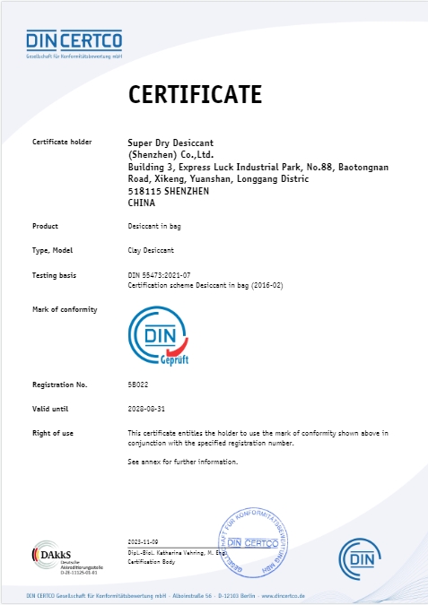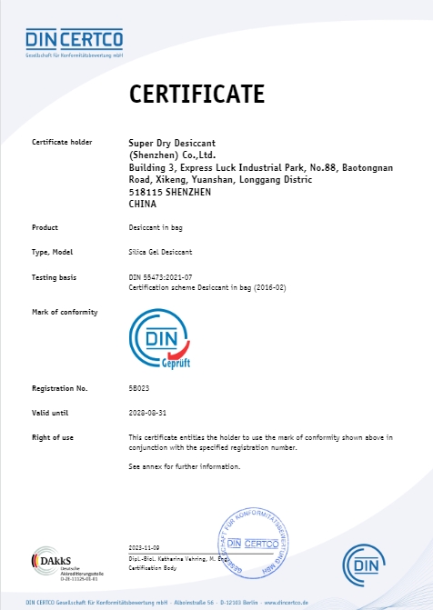 DIN认证代表了德国对于产品标准的严格要求和对于质量的极高追求。通过DIN认证,意味着干霸公司的矿物干燥剂及硅胶干燥剂产品已经符合德国的最高标准,其产品的质量、性能和安全性都得到了充分的肯定。